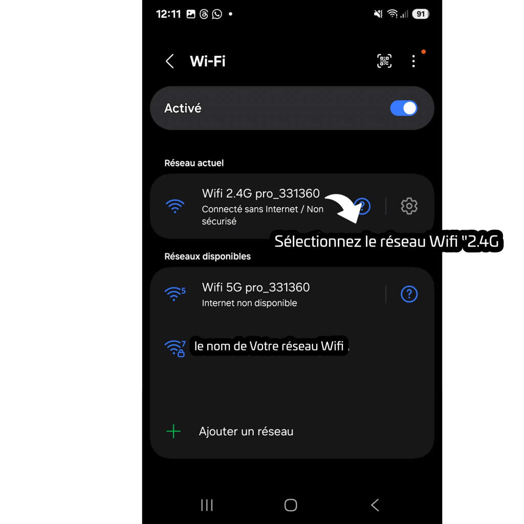 ** Sélectionnez le réseau Wifi « 2.4G pro _331360 » pour vous y connecter.