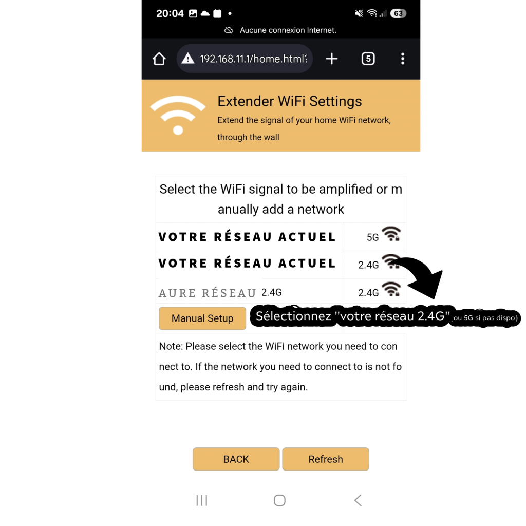Étape 2 : Sélectionnez le signal sans fil que vous souhaitez étendre (Ex: votre réseau domicile). S’il s’agit d’un réseau caché, vous devrez l’ajouter manuellement.