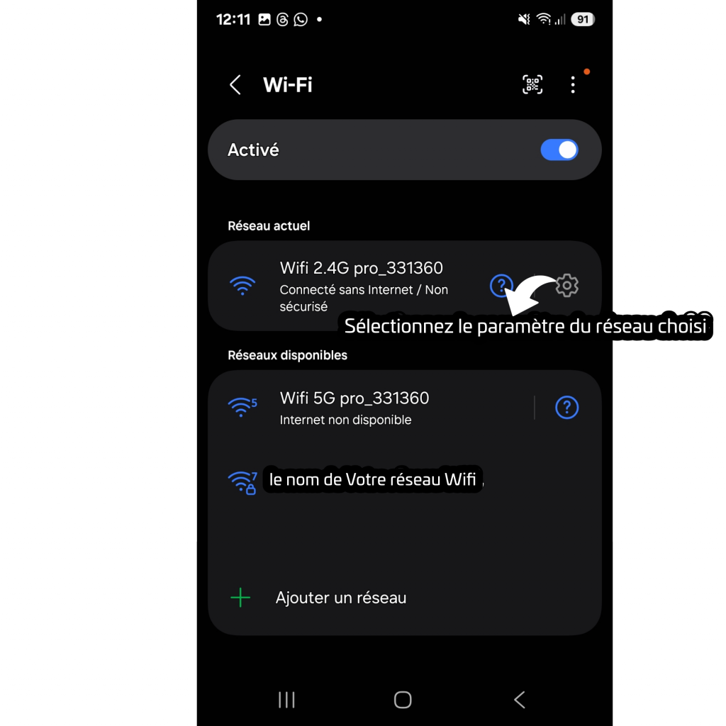 Sélectionnez le paramètre du réseau choisi